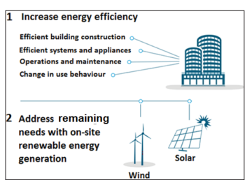 Net Zero Energy Building (NZEB) · In order to achieve their net zero energy goals, NZEBs must first reduce energy demand using energy efficient technologies, and then utilize renewable energy sources to meet the residual energy demand (Figure 8.2). In such buildings, efficiency gains enable the balance of energy needs to be met by renewable energy technologies. · NZEB is aimed at eliminating greenhouse gas (GHG) emissions associated with the operation of new buildings by 2030, and eliminate the GHG emissions from all buildings by 2050. Meeting NZEB objectives will require addressing both active and passive measures along with energy generation/supply from renewable energy such as Solar Photovoltaic, Winds, Biogas, and any other applicable hybrid renewable energy system. Achieving zero energy is an ambitious, yet increasingly achievable goal |
