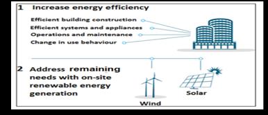 · In order to achieve their net zero energy goals, NZEBs must first reduce energy demand using energy efficient technologies, and then utilize renewable energy sources to meet the residual energy demand (Figure 8.2). In such buildings, efficiency gains enable the balance of energy needs to be met by renewable energy technologies. · NZEB is aimed at eliminating greenhouse gas (GHG) emissions associated with the operation of new buildings by 2030, and eliminate the GHG emissions from all buildings by 2050. Meeting NZEB objectives will require addressing both active and passive measures along with energy generation/supply from renewable energy such as Solar Photovoltaic, Winds, Biogas, and any other applicable hybrid renewable energy system. Achieving zero energy is an ambitious, yet increasingly achievable goal. · |